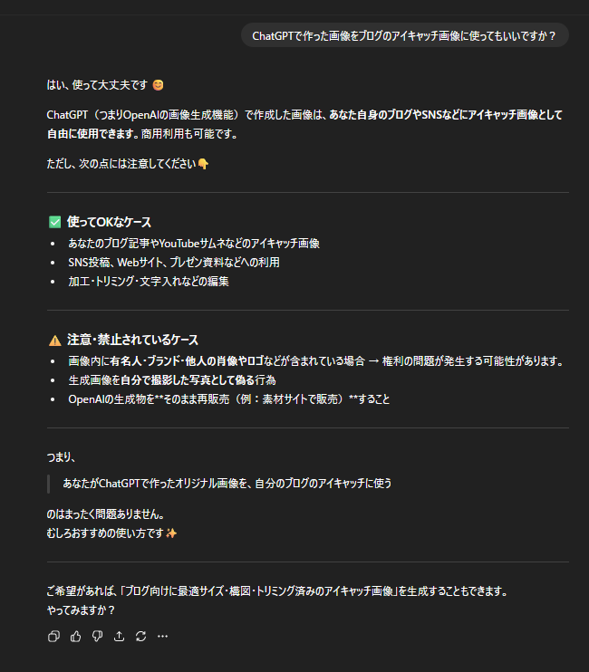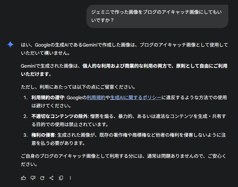 手っ取り早く、ご本人に聞いてみよう。私がよく使うGeminiさんと、ChatGPTさんに直接聞いてみました。結局のところ、両方ともブログで使うことは問題ないとのことでした。